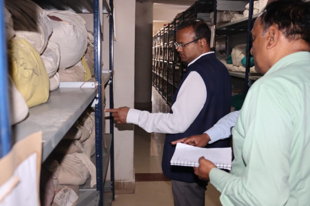 अभिलेखागार के निरीक्षण के दौरान जिलाधिकारी ने अभिलेखों के पुराने बस्ते को बदलकर नया करने, अभिलेखों को सुव्यवस्थित रखने एवं कार्यालय में नियिमत साफ-सफाई रखने के निर्देश संबंधित पटल सहायक को दिया।
